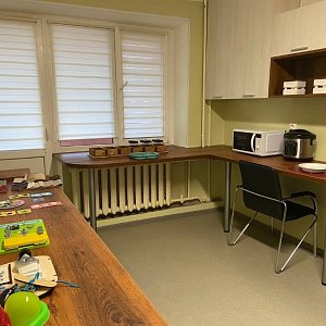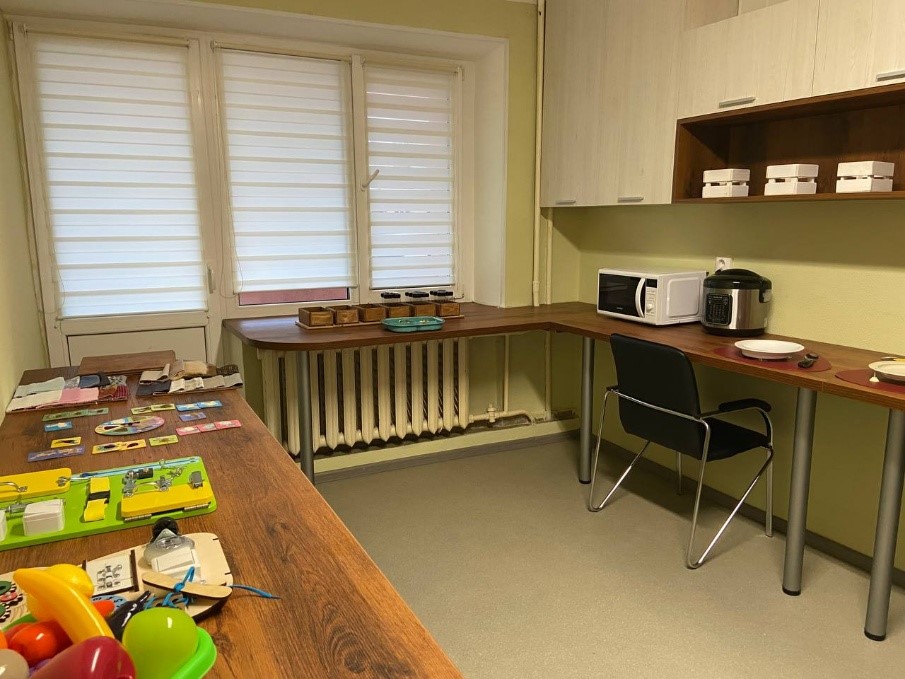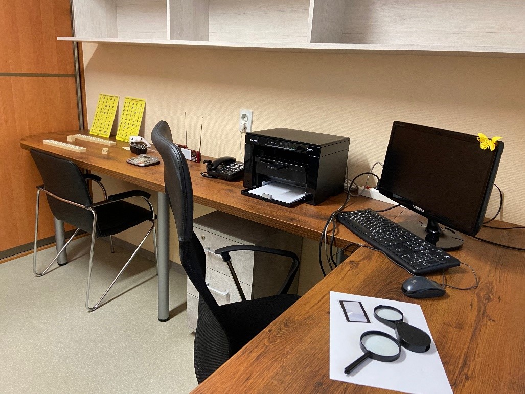 Для создания и функционирования отделения социальной реабилитации были проведены следующие работы: материально-техническое оснащение (приобретено специализированное реабилитационное оборудование, тифлотехника, оборудованы помещения (комнаты) для проведения занятий по социальной реабилитации и абилитации), организована доступная среда для инвалидов по зрению (тактильные указатели, контрастная маркировка и т.д.). На этаже, где размещается отделение социальной реабилитации, выполнен текущий ремонт.